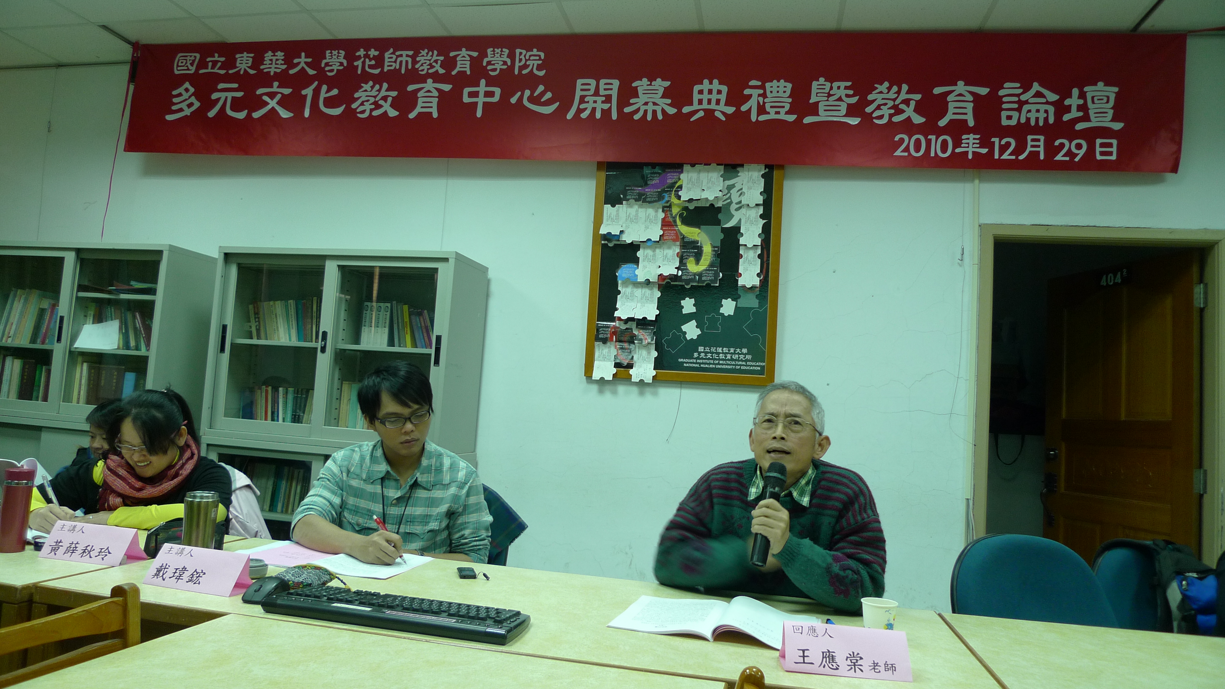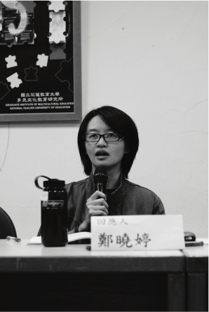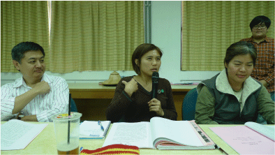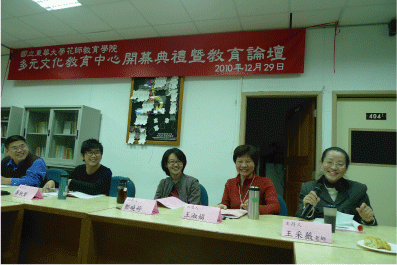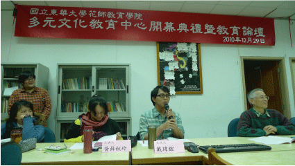 在場參與者發言:戴玉蘭(右一)表示民國90年覺得當時的工作沒有價值,後來,想為自己過每一天的生活,而選擇當英文代課老師。在日常生活中會碰到原住民,瞭解他們經濟的困難,而幫他們銷售玉米及地瓜,體會到大家都是為了一口飯吃,一張床睡覺。魯木‧伊木伊(中)表示:自己在靜浦國小教書,也一直在尋找如何讓原住民孩童成績也不差,也能強化自身力量的教育方法。